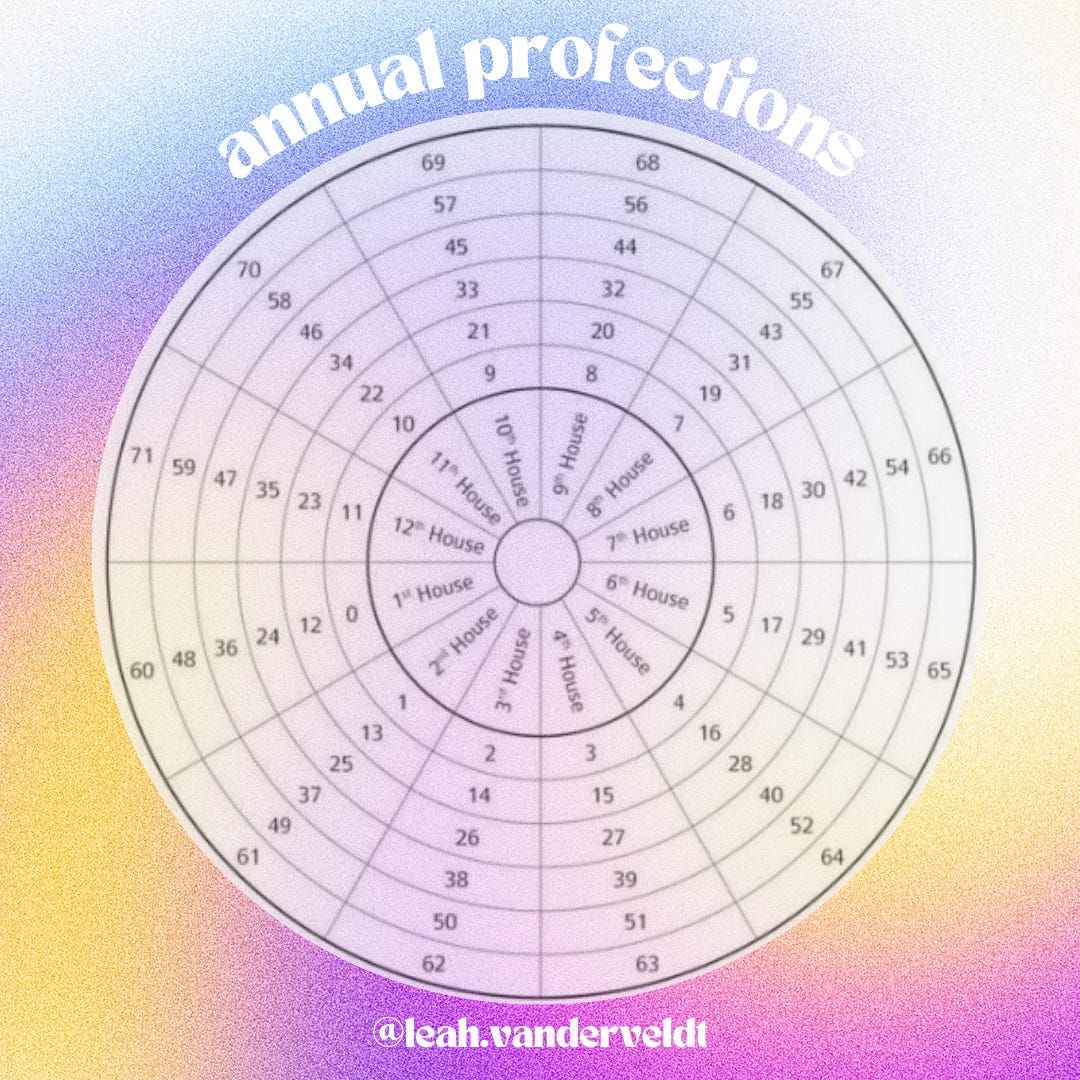 Annual profections are a timing technique that can determine the themes of your year by the age you are. Each age corresponds to a house of the zodiac. Houses represent areas of life, making this a simple way to zoom in on some major throughlines of your year ahead.